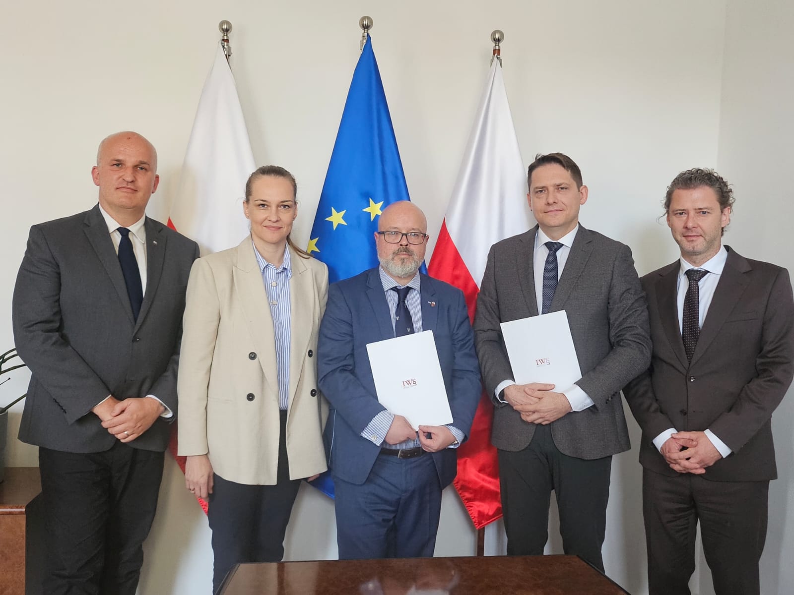Na zdjęciu od lewej: Piotr Marquardt - członek KRN, Magdalena Arendt - wiceprezes KRN, Aleksander Szymański - prezes KRN, dr hab. Piotr Rylski – dyrektor IWS, dr hab. Maciej Domański – zastępca dyrektora IWS.
